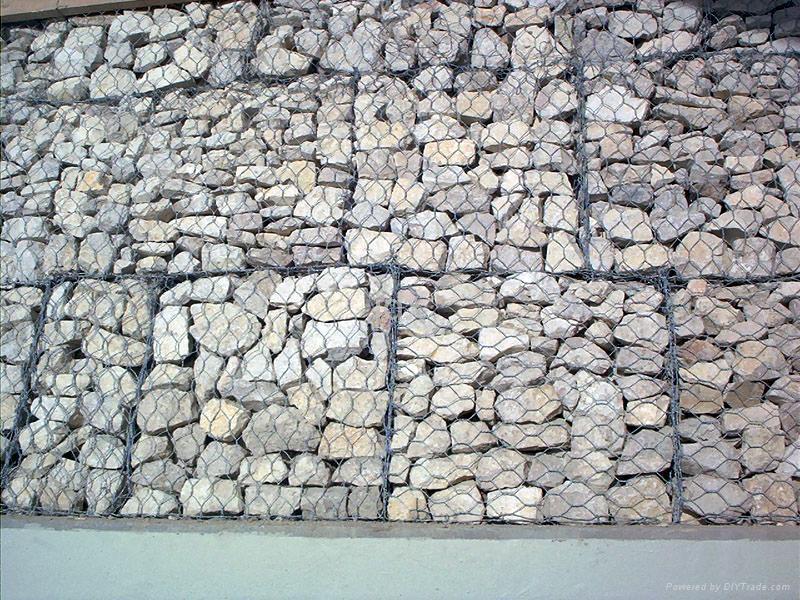 石籠網由高抗腐蝕、高強度、具有延展石籠網箱性的低碳鋼絲或者包覆PVC的以上鋼絲使用機械編織或者焊接而成,把網製作而成的箱型結構就是石籠。根據ASTM和EN標準,所使用的低碳鋼絲直徑根據工程設計要求而不同。一般介於2.0-4.0mm之間,石籠網鋼絲的抗拉強度不少於38kg/m2,金屬鍍層重量一般高於245g/m2,石籠網片的邊緣線直徑一般要大於網線直徑。其雙線絞合部分的長度不得小於50mm.以保證絞合部分鋼絲的金屬鍍層和PVC鍍層不受破壞